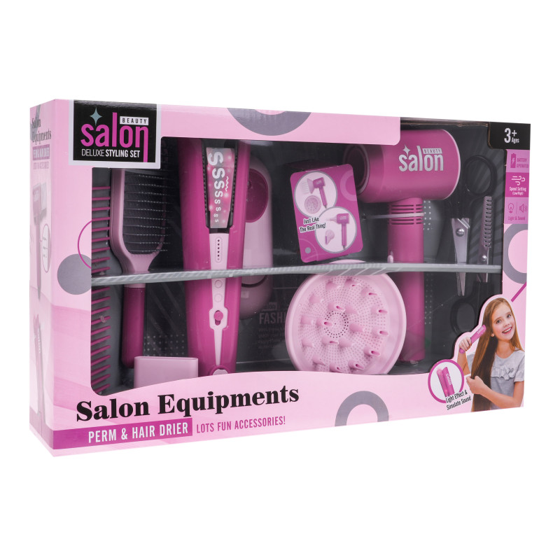 Interaktyvus, gerai įrengtas kirpyklos rinkinys su plaukų džiovintuvu su keičiamais antgaliais ir akumuliatoriniu plaukų tiesintuvu skirtas vaikams nuo 3 metų. Rinkinyje yra įvairių kirpėjo darbui reikalingų priemonių, įskaitant plaukų džiovintuvą, tiesintuvą, žirkles, plaukų šukas ir kitus priedus. Plaukų džiovintuvas skleidžia džiovinimo garsą ir skleidžia oro srovę. Jis turi dviejų pakopų oro srauto reguliavimą, o džiūdamas skleidžia garsus kaip tikras. Tiesintuvas turi šviesos efektus ir garsus, lydinčius plaukų tiesinimą. Plaukų džiovintuvą maitina 3 x AAA baterijos (į komplektą neįeina), tiesintuvą - 2 x AAA baterijos (į komplektą neįeina). Rinkinio ypatybės: - plaukų džiovintuvas su keičiamais antgaliais (difuzorius ir koncentruojantis antgalis), - džiovintuvas skleidžia oro srovę, - džiovintuvas turi dviejų pakopų oro srauto reguliavimą, - džiovintuvas skleidžia džiovinimo garsus, - tiesintuvas turi uždarymo ir atidarymo slankiklį, - tiesintuvas turi apšvietimą, - tiesintuvas skleidžia plaukų tiesinimui būdingus garsus, - praktiškas džiovintuvo stovas. | |