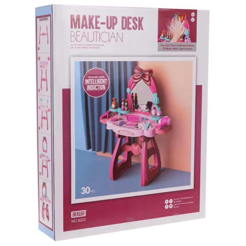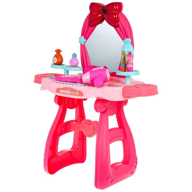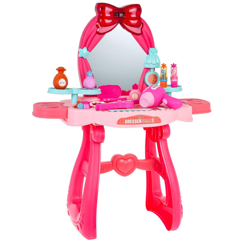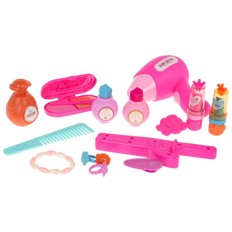 - tualetinis staliukas, - tiesintuvas, - džiovintuvas, - atidaroma kosmetinė su šepetėliu ir netikrais akių šešėliais, - šukos, - kvepalų buteliukas, - 2x nagų lakas, - 2 x lūpų dažai, - 3x žiedas, - 2 x segtuką, - apyrankė, - dekoratyviniai lipdukai. |