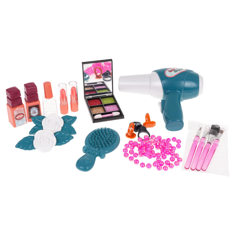 - tualetinis staliukas, - taburetė, - džiovintuvas, - koralai, - apyrankė, - 2 x lūpų dažų maketai, - netikras nagų lakas, - kvepalų klastotės, - kosmetikos indelis, - 2 x plaukų segtukas, - plaukų šepetys, - 4 x žiedas, - kosmetinė su veidrodėliu, šepetėliu ir akių šešėlių imitacija, - 4 x dažymo šepetėlis. |