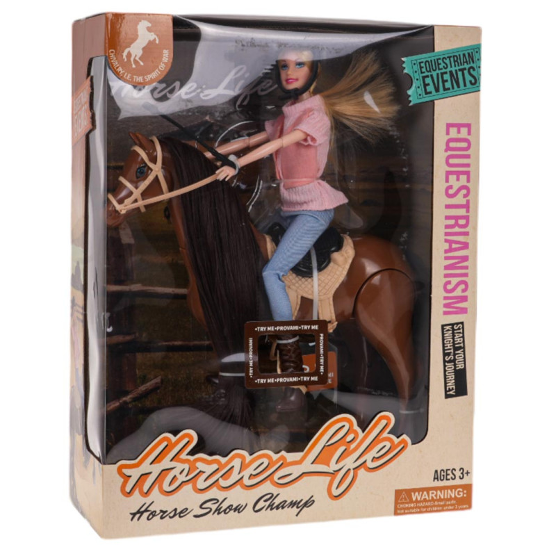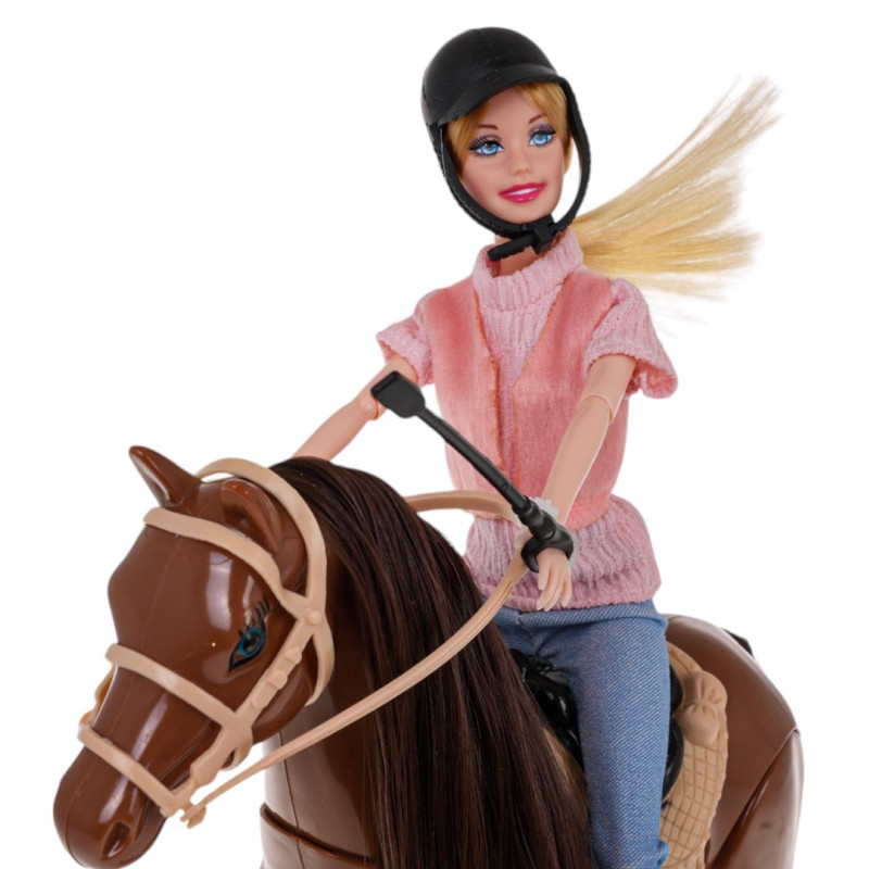 Lėlės rinkinys su žirgu ir priedais, skirtas vaikams nuo 3 metų amžiaus. Rinkinį sudaro gražus žirgas ilgais karčiais ir lėlė. Lėlė turi judančius elementus: rankas, kojas, galvą ir gražius ilgus plaukus. Žirgas maitinamas 3 x AA 1,5 V baterijomis (pridedamos). Jis juda pirmyn, judina galvą ir leidžia garsus, kaip tikras gyvūnas.