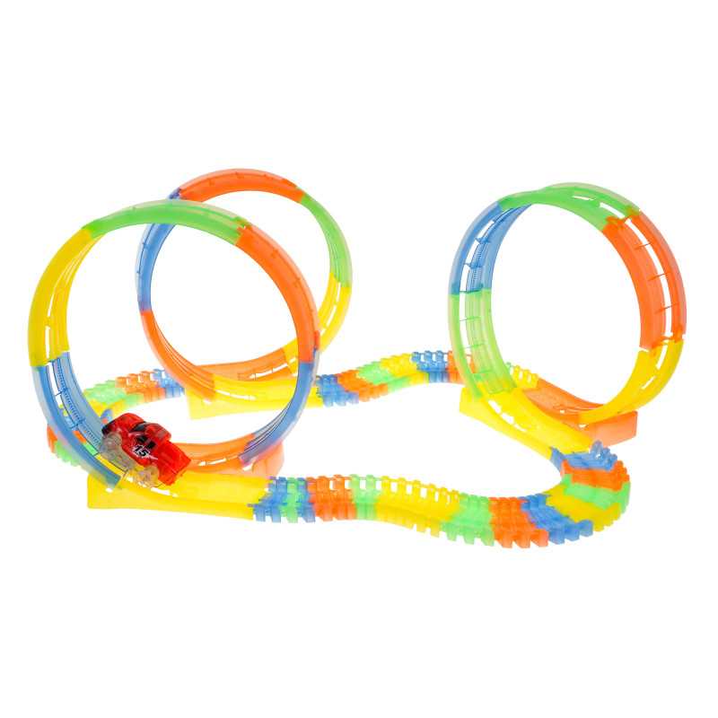 Tamsoje šviečianti trasa su 3 kilpomis ir įeinančiu automobiliu skirtas vaikams nuo 3 metų. Rinkinį sudaro 148 elementai. Yra tiesių atkarpų ir kilpų, kuriose automobilis apsisuka 360 laipsnių kampu. Trasa yra fluorescencinė ir šviečia tamsoje. Rinkinyje esantis automobilis turi LED apšvietimą, todėl važiuojant tamsoje sukuriamas nuostabus efektas. Transporto priemonė maitinama 2 x AA tipo baterijomis (į komplektą neįeina). Norint užvesti automobilį, tereikia paspausti ant jo stogo esantį mygtuką. Bendras trasos ilgis - 468 cm. | |