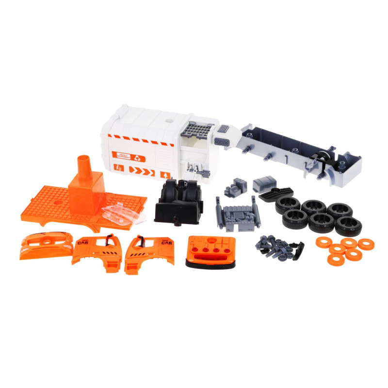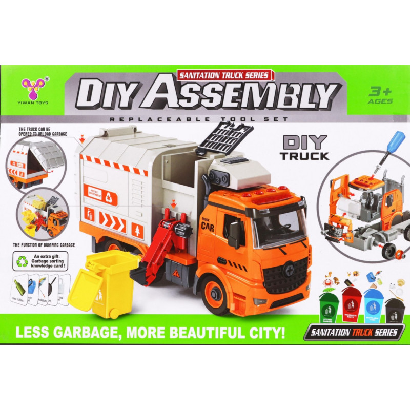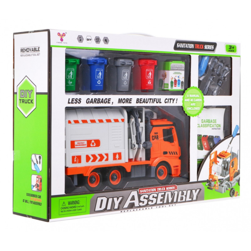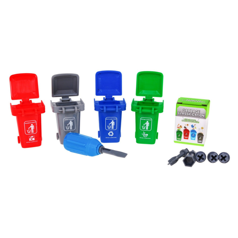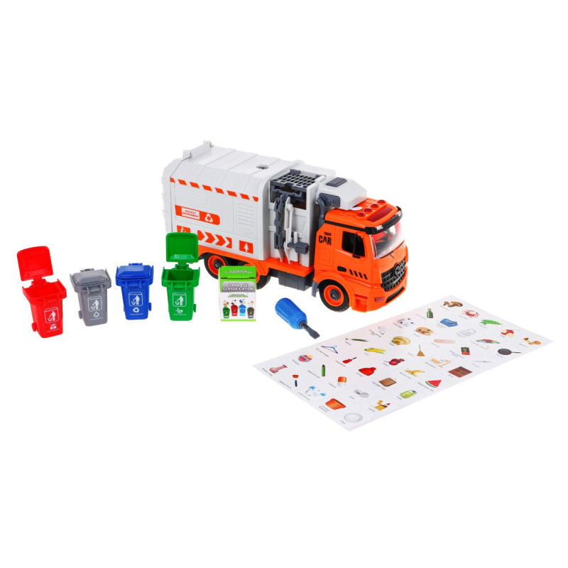 | Pateiktas konteinerių ir šiukšliavežės rinkinys yra priemonė mokytis žaidžiant. Jis neabejotinai patiks kiekvienam transporto priemonių ir "pasidaryk pats" entuziastui. Šiukšliavežę galima išardyti naudojant pridedamą atsuktuvą su keičiamais antgaliais, o paskui vėl surinkti. Automobilis turi garso ir šviesos funkcijas. Transporto priemonės šone yra strypas, skirtas pritvirtinti ir išversti konteinerius su rūšiuotomis atliekomis. Šiukšlės pakeičiamos kortelėmis su įvairių rūšių atliekų iliustracijomis. Rinkinyje taip pat yra paveikslėlių knygelė. Iš instrukcijų vaikas sužinos, kokias šiukšles į kokį konteinerį reikia mesti. Žalia spalva - virtuvės atliekos, mėlyna - perdirbamos šiukšlės, pilka - kitos šiukšlės, raudona - pavojingos atliekos. Žaisdamas su šiukšliavežiu vaikas išmoks rūpintis aplinka rūšiuodamas atliekas. Ugdys aplinkosauginį sąmoningumą. Žaislas skirtas vaikams nuo 3 metų. Maitinimo šaltinis 3 x LR44 (įeina į komplektą). | |