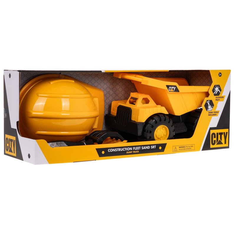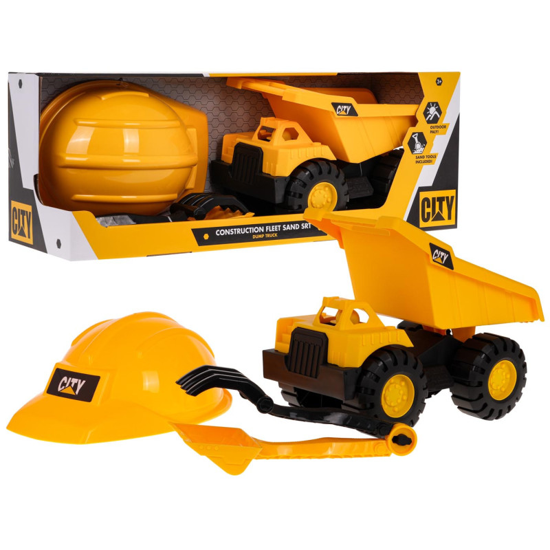 Smėlio rinkinys su savivarčiu, šalmu, grėbliu ir kastuvu vaikams nuo 3 metų. Rinkinys pagamintas iš geriausios kokybės medžiagų. Savivartis turi judančių elementų. Priekabą galime pakelti ir nuleisti rankiniu būdu. Dideli ratai leidžia važiuoti bet kokiu reljefu. Rinkinyje yra šalmas mažajam statybininkui ir grėblys bei kastuvas smėliui.