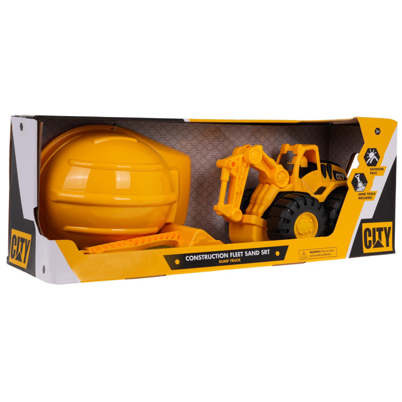 - ekskavatorius su judančiomis dalimis, -šalmas mažajam statybininkui, - kastuvas ir grėblys smėliui. |