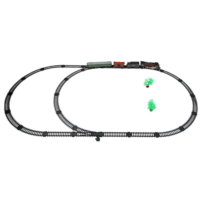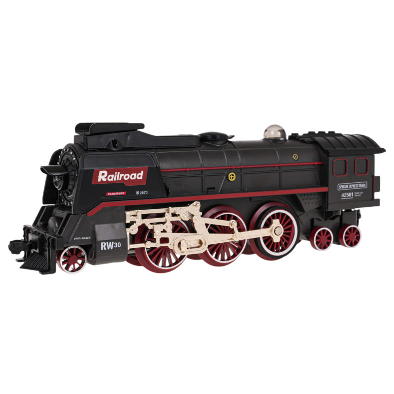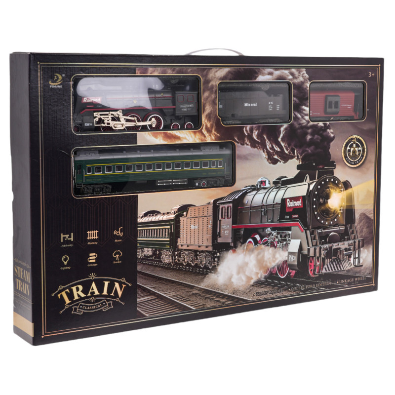 Retro traukinio rinkinys su dūmų funkcija ir važiavimo garsais, bei bėgiais, yra pasiūlymas vaikams nuo 3 metų amžiaus. Žaislas maitinamas 3,7 V 1200 mAh baterija (pridedama). Važiuojant, lokomotyvas išskiria dūmus iš kamino ir šonų (prieš tai pripildžius vandens – vandens pipetė pridedama), be to, įsijungia priekinėje dalyje įmontuota šviesa. Bėgiai lengvai jungiami, todėl yra saugūs ir patvarūs naudoti.