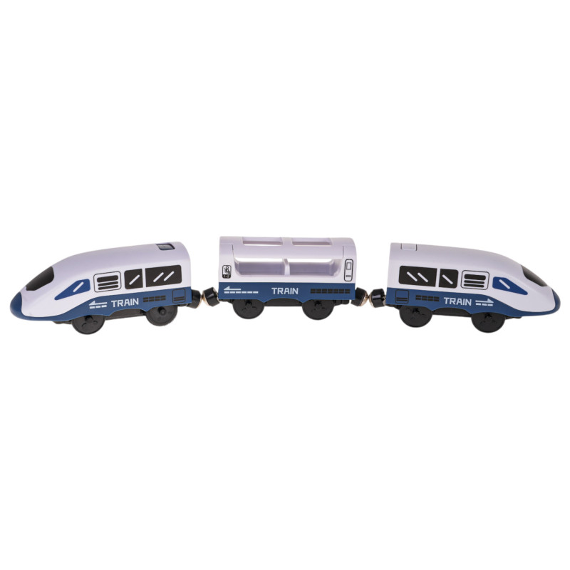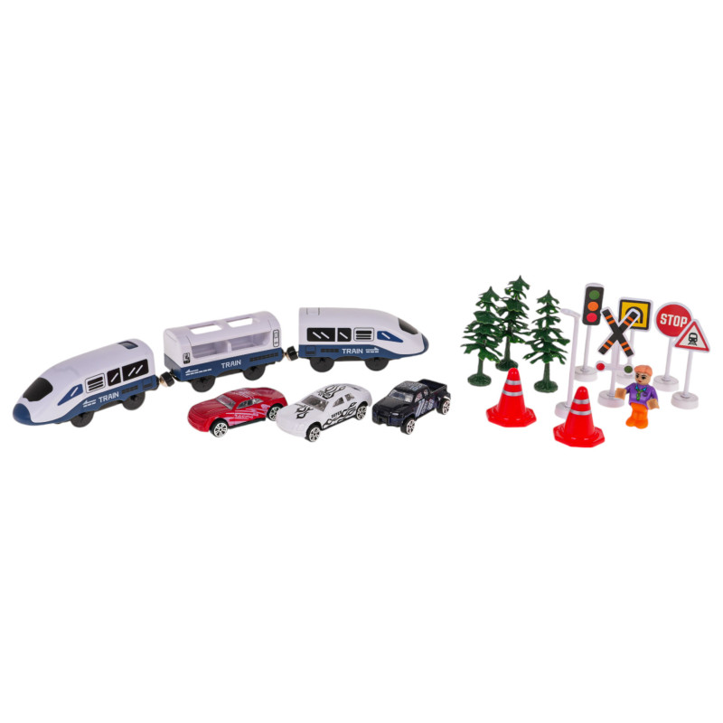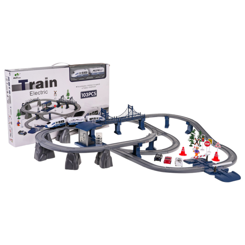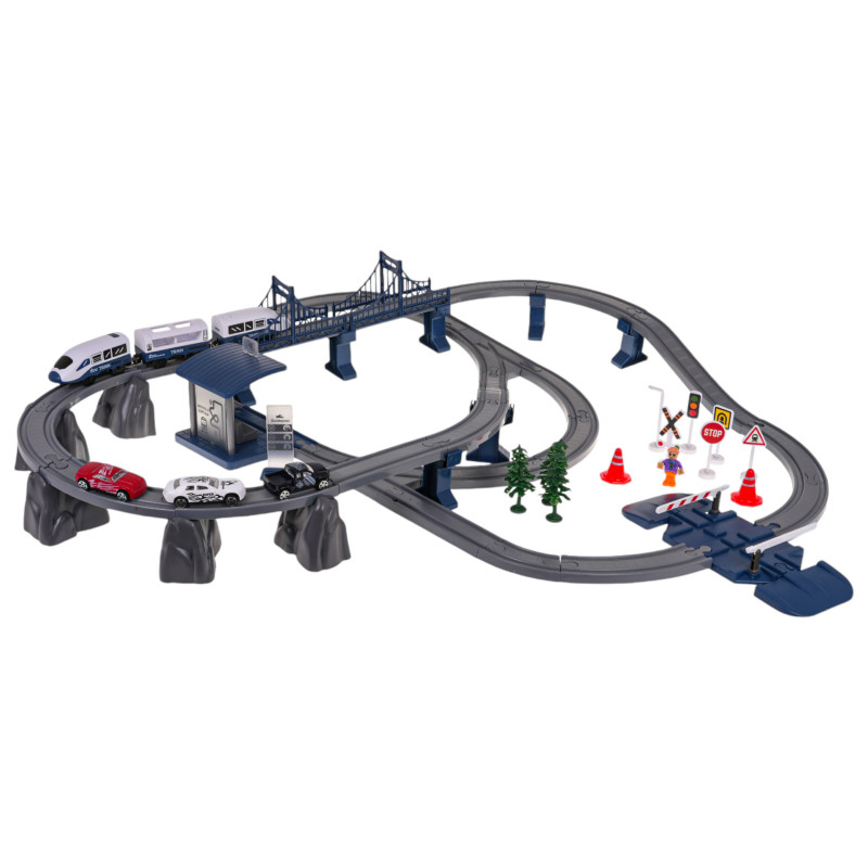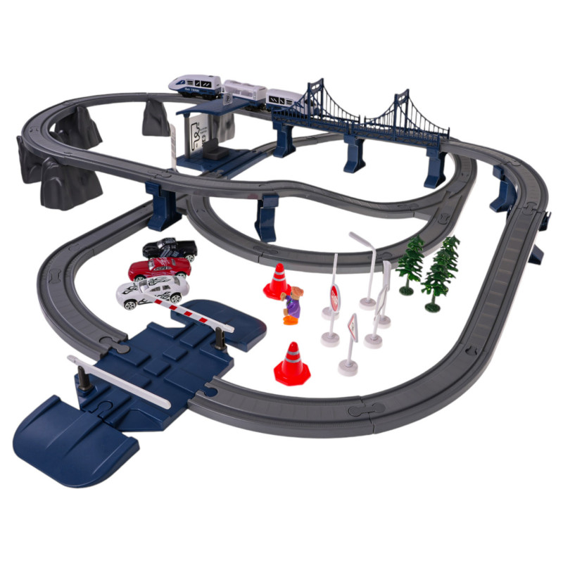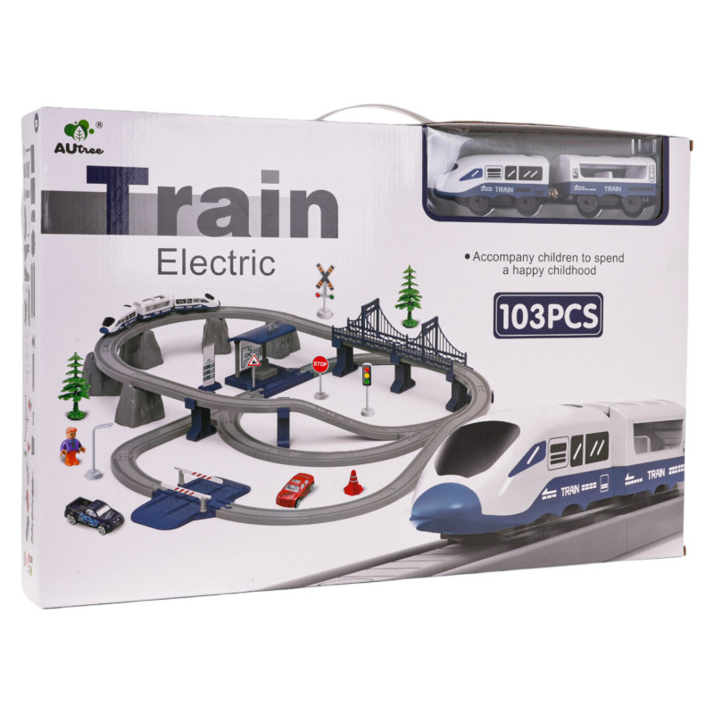 Gausiai aprūpintas geležinkelio bėgių, traukinio ir priedų rinkinys, skirtas vaikams nuo 3 metų amžiaus. Rinkinys pagamintas iš geriausios kokybės plastiko, yra tvirtas ir ilgaamžis. Jį sudaro net 103 elementai: dvejų lygių bėgių konstrukciniai elementai, traukinys, stotis su garso ir šviesos efektais, tiltas, užtvaras, kelio ženklai, automobiliai ir berniuko figūrėlė. Stotis maitinama 3 x AG3 1,5 V baterijomis (pridedamos), traukinys – 2 x AAA 1,5 V baterijomis (nepridedamos).