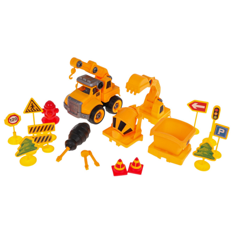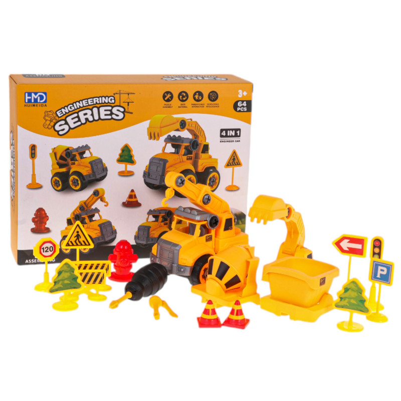 „4 viename“ statybinės transporto priemonės rinkinys su priedais, skirtas vaikams nuo 3 metų amžiaus. Rinkinys pagamintas iš aukščiausios kokybės plastiko. Dėl keičiamų elementų, statybinis automobilis gali būti transformuojamas arba išardomas į sudedamąsias dalis. Rinkinį sudaro atsuktuvas su keičiamais antgaliais.