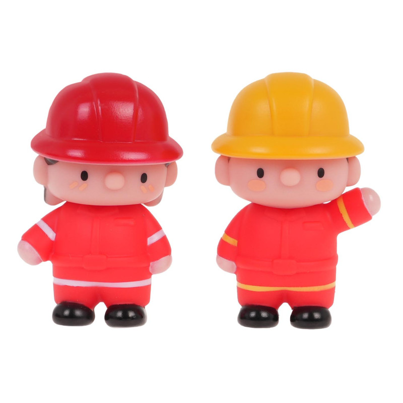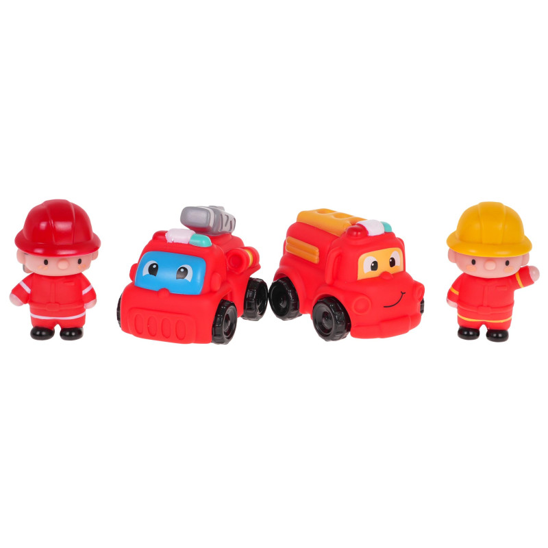 Spalvingas rinkinys su ugniagesių ir gaisrinių automobilių figūrėlėmis vyresniems nei 3 metų vaikams. Rinkinį sudaro dvi ugniagesių figūrėlės ir du gaisriniai automobiliai. Automobiliai ir figūrėlės pagaminti iš gumos, o transporto priemonių ratai - iš plastiko. Rinkinio ypatybės: - tinka vyresniems nei 3 metų vaikams, - ryškiomis spalvomis, - puikiai tinka vaidmeniniams žaidimams, - gaisrininkų figūrėlės turi besisukančias galvas, - ugniagesys su geltonu šalmu viduje turi barškutį, - automobilių viduje yra barškučiai. | |