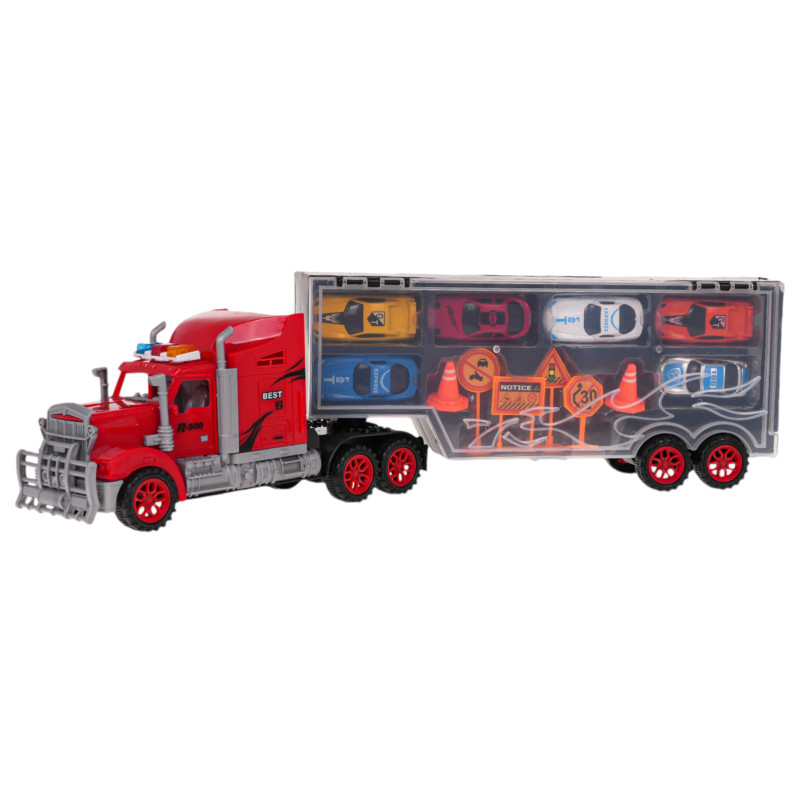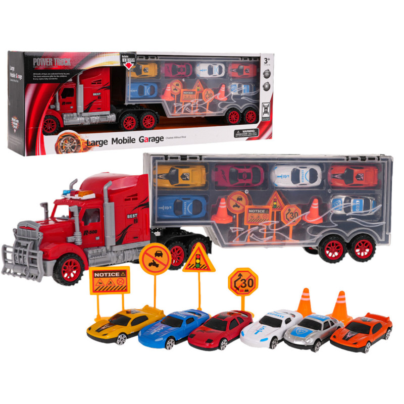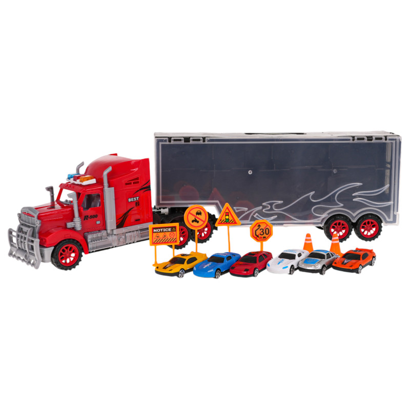 Didelis sunkvežimis su priekaba, automobiliais ir priedais, skirtas vaikams nuo 3 metų amžiaus. Žaislas pagamintas iš puikios kokybės medžiagų, ryškiomis spalvomis. Didelis sunkvežimis turi priekabą, kurioje telpa 6 automobiliai, kelio ženklai ir stulpai. Priekabą galima atkabinti nuo sunkvežimio – tuomet gausite lagaminą transporto priemonėms su patogia nešimo rankena. Galinės priekabos durys atsidaro ir sukuria platformą, skirtą transporto priemonėms išvažiuoti.