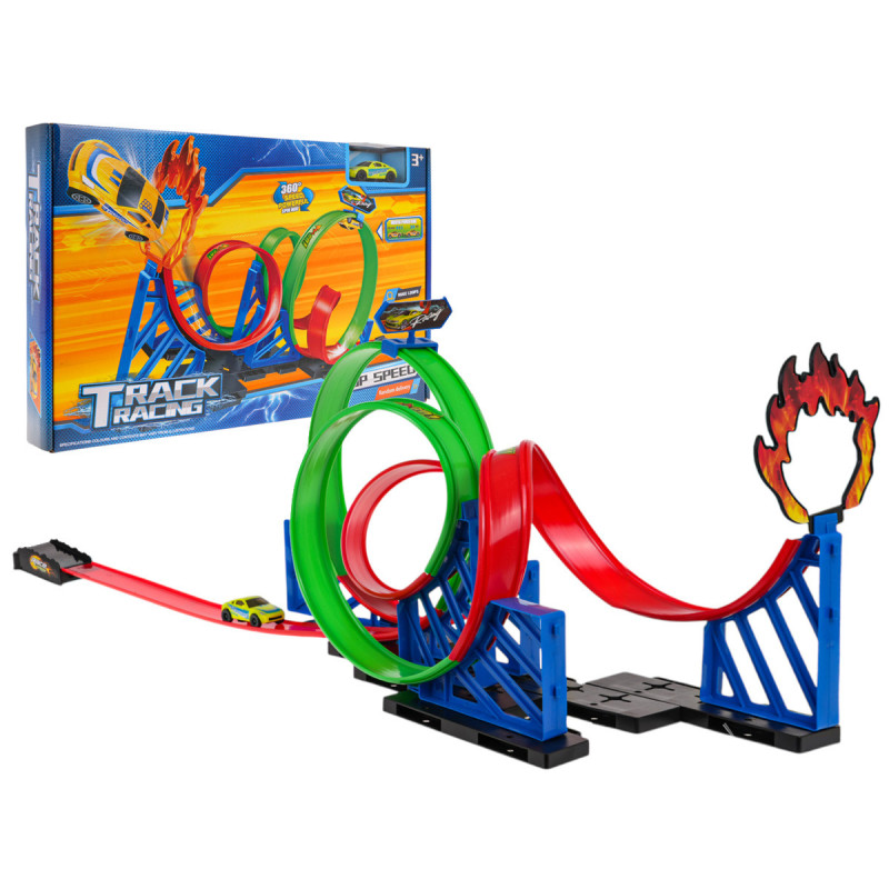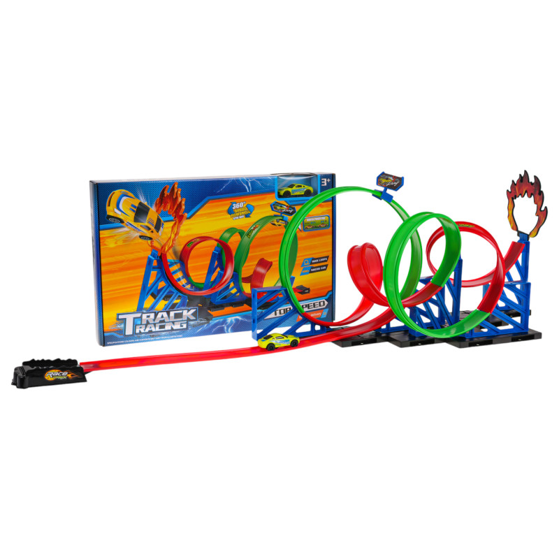 Lenktynių trasa su 360 laipsnių kilpomis, skirta vaikams nuo 3 metų amžiaus. Trasa pagaminta iš geriausios kokybės plastiko, ryškiomis spalvomis. Trasa turi tiesią atkarpą transporto priemonei įsibėgėti, kelias 360 laipsnių kilpas ir transporto priemonę su atgal traukiama (pull-back) pavara. Tiesiog švelniai atgal pastumkite transporto priemonę, kad ji pilna galia apvažiuotų trasą.