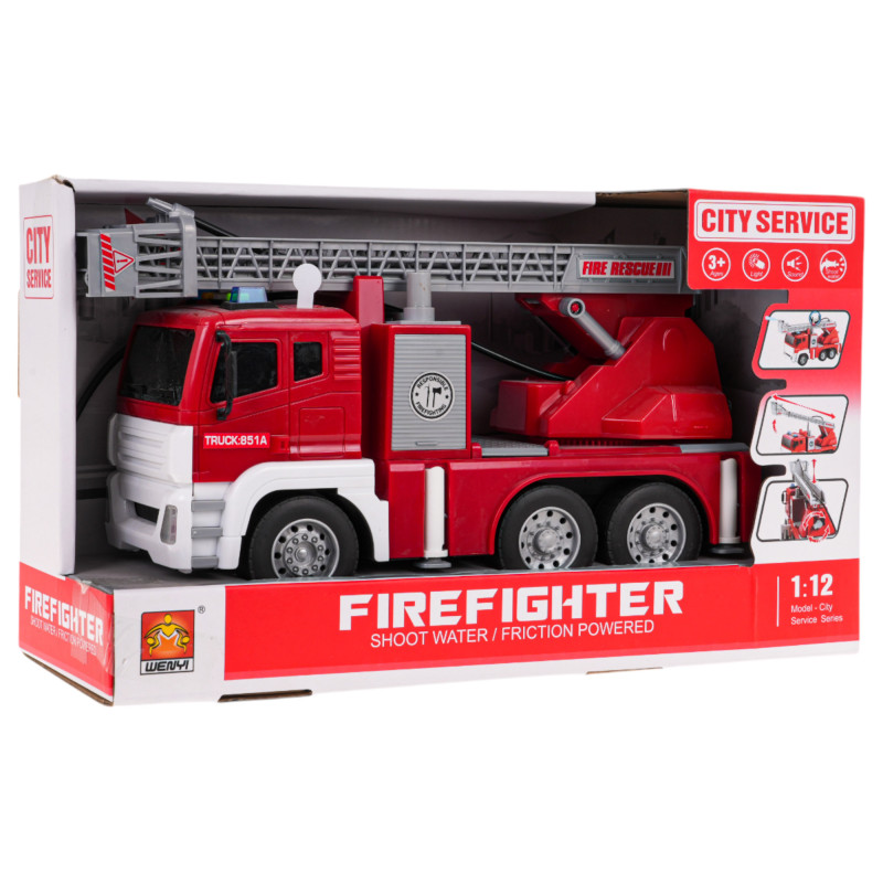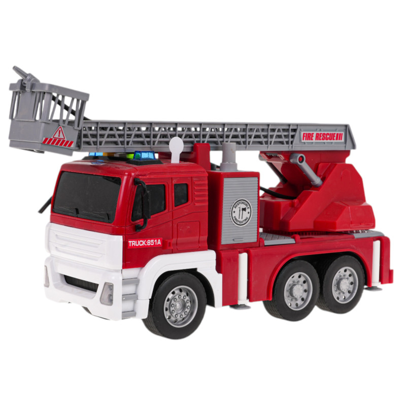 Interaktyvi gaisrinės mašina su garso ir šviesos funkcija bei vandens liejimu, skirta vaikams nuo 3 metų amžiaus. Gaisrinės mašina pagaminta iš geriausios kokybės medžiagų, ryškiomis spalvomis. Ji turi judančius elementus, tokius kaip reguliuojamos kopėčios (aukštyn ir žemyn), taip pat ištiesiamos ir sutraukiamos. Kopėčių gale yra platforma su gaisrinės žarnos galu, iš kurio teka vanduo. Priešais priekabą yra vandens rezervuaras. Pripildžius rezervuarą vandens, tereikia paspausti mygtuką, esantį ant rezervuaro viršaus, ir vanduo pradės tekėti. Ant gaisrinės mašinos kabinos stogo yra mygtukai, kuriuos paspaudus girdimas sirenos signalas, garso signalas arba transporto priemonės užvedimo garsas. Garsus lydi mirksinčios šviesos ant transporto priemonės stogo. Transporto priemonė turi gumines padangas ir inercinę pavarą ant priekinės ašies. Ji maitinama 3 x AG13 baterijomis (pridedamos).