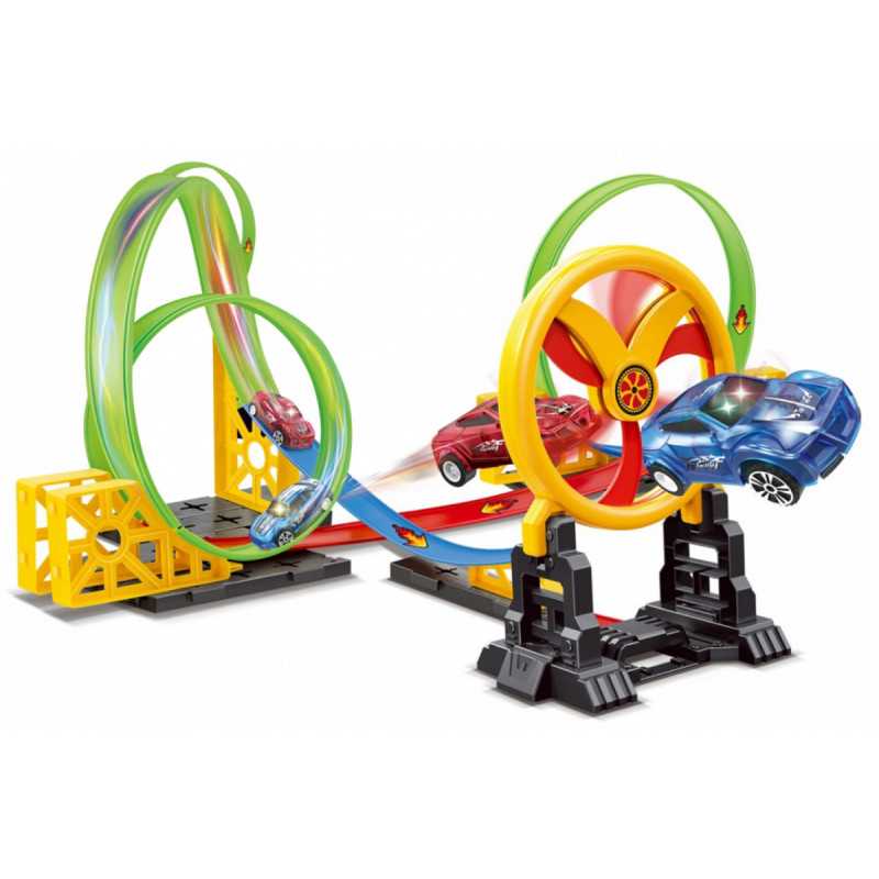 | Lenktynių trasa su dviem automobiliais, kilpomis ir judančiu šokinėjimo ratu - tinkamas vaikams nuo 3 metų. Automobiliai varomi 3 AG13 baterijomis, kurios yra komplekte, maitinami ir turi LED apšvietimą. Trasą lengva kloti, ji neužima daug vietos ir yra lengvai valdoma. Tereikia pagreitinti automobiliuką išilgai trasos, kuris vėliau pravažiuoja tris kilpas ir peršoka per turėklus. Turėklai yra kilnojamieji, todėl automobilis ne visada gali juos pervažiuoti. | |