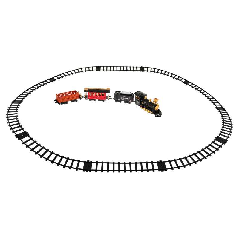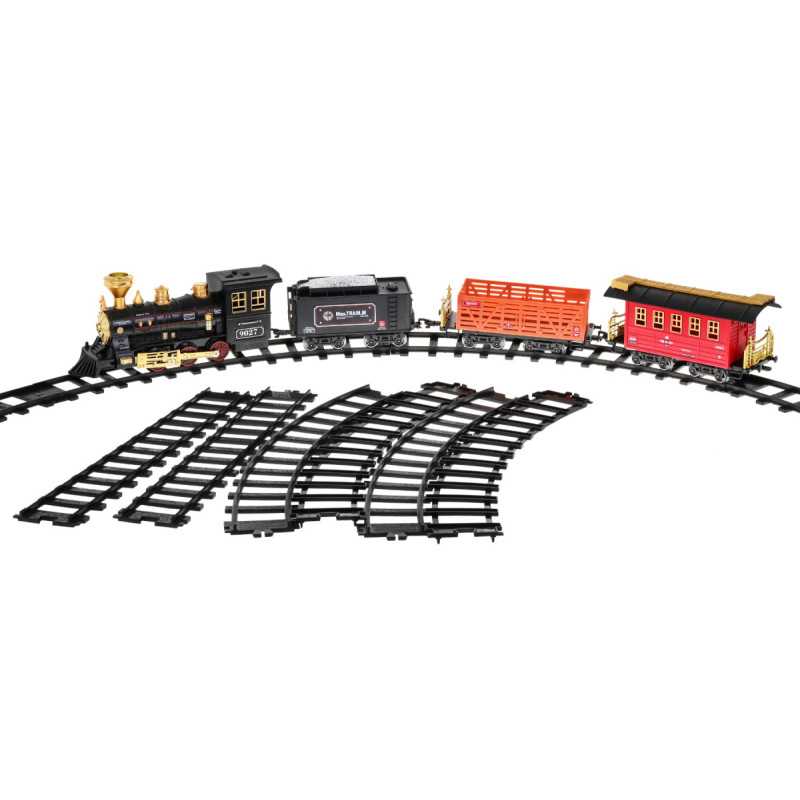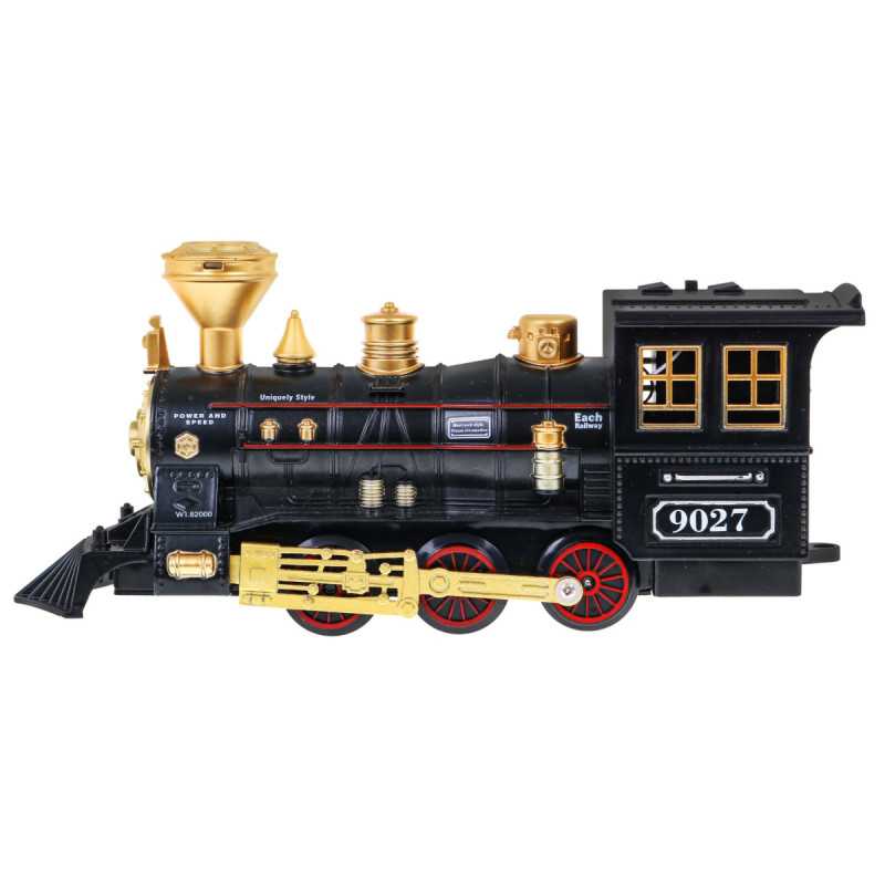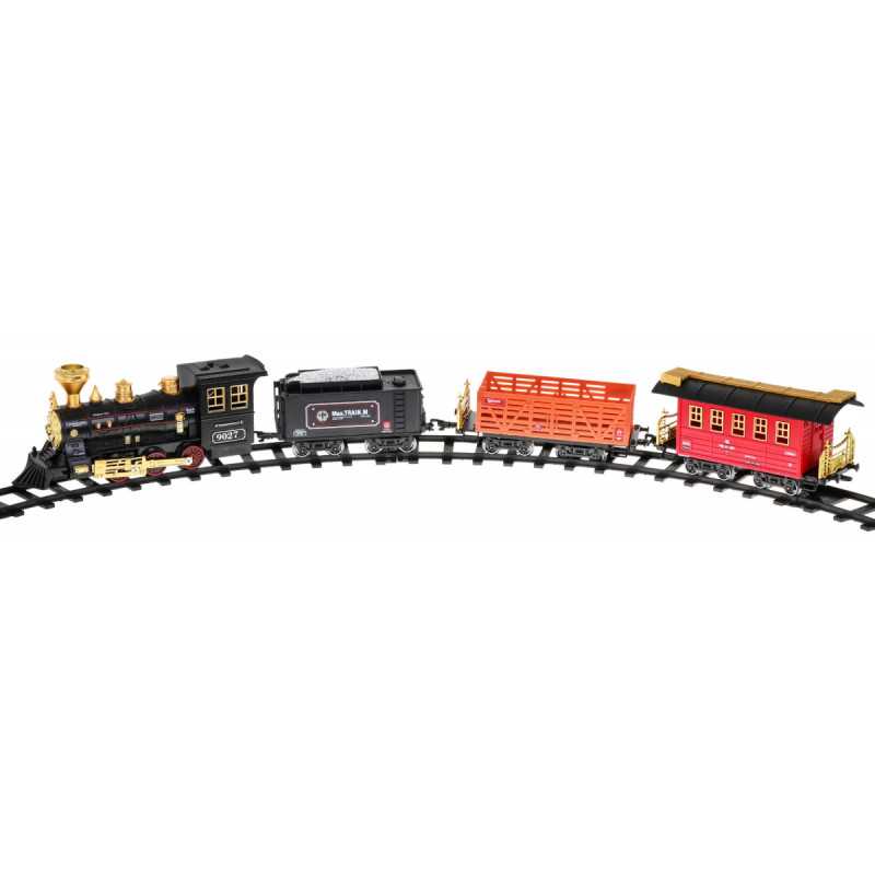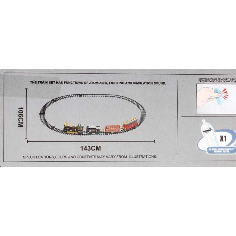 | Nuostabus traukinys su dūmų funkcija ir važiavimo garsais yra tinkamas vaikams nuo 5 metų. Žaislas maitinamas 4 x AA 1, 5 V baterijomis, kurios į komplektą neįeina. Baterijas montuojame į lokomotyvą. Traukinuko maršrutas yra elipsės formos, jo matmenys maždaug 143 cm x 106 cm. Važiuojant lokomotyvas iš kamino (pripildžius jį vandeniu - į rinkinį įtraukta vandens pypkė) leidžia dūmus, be to, užsidega priekinėje dalyje sumontuota lemputė. Bėgiai turi lengvą sujungimo būdą, dėl to juos saugu ir patogu naudoti. | |