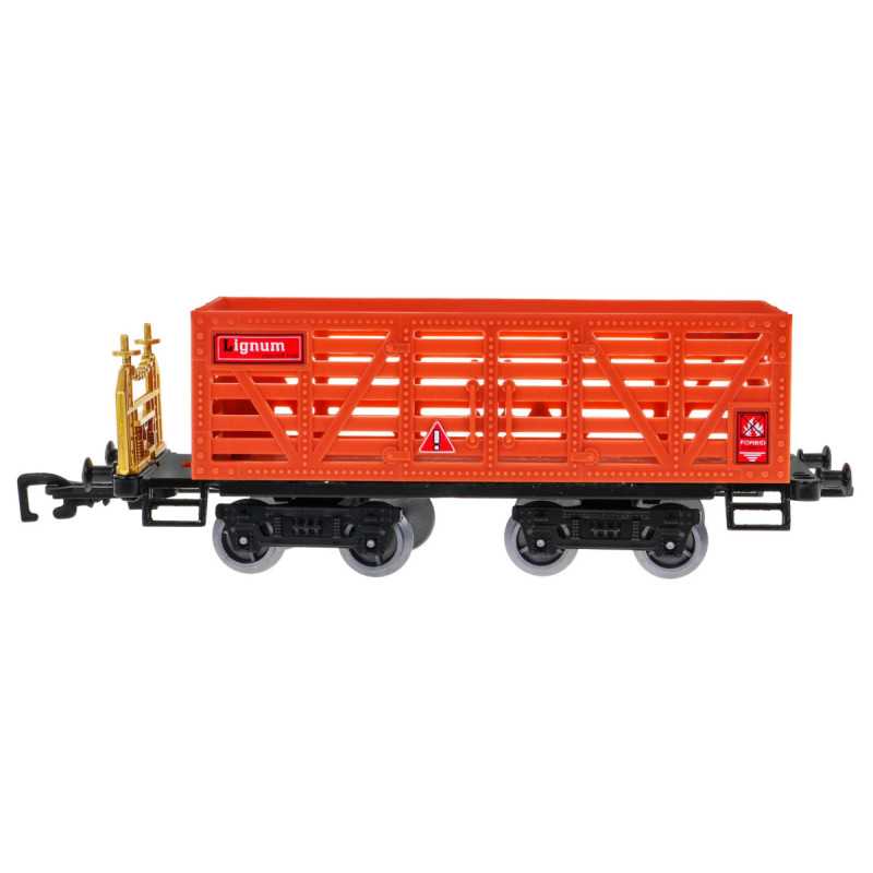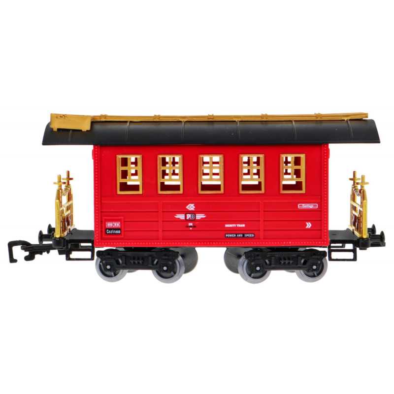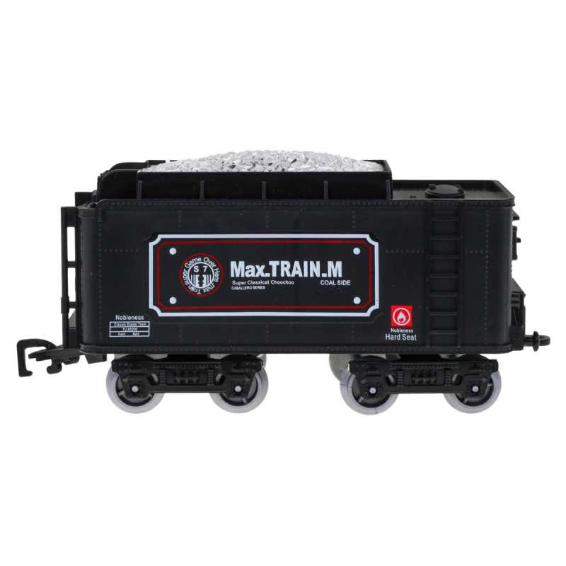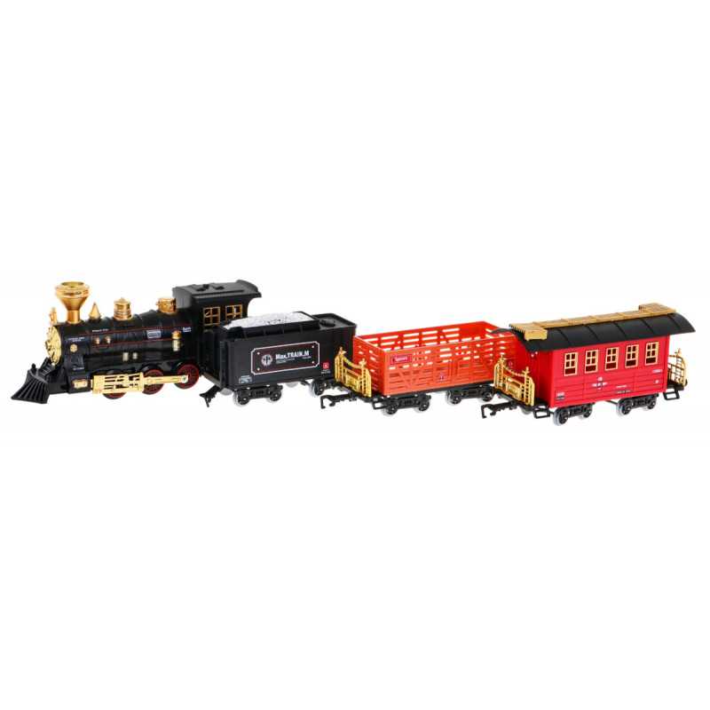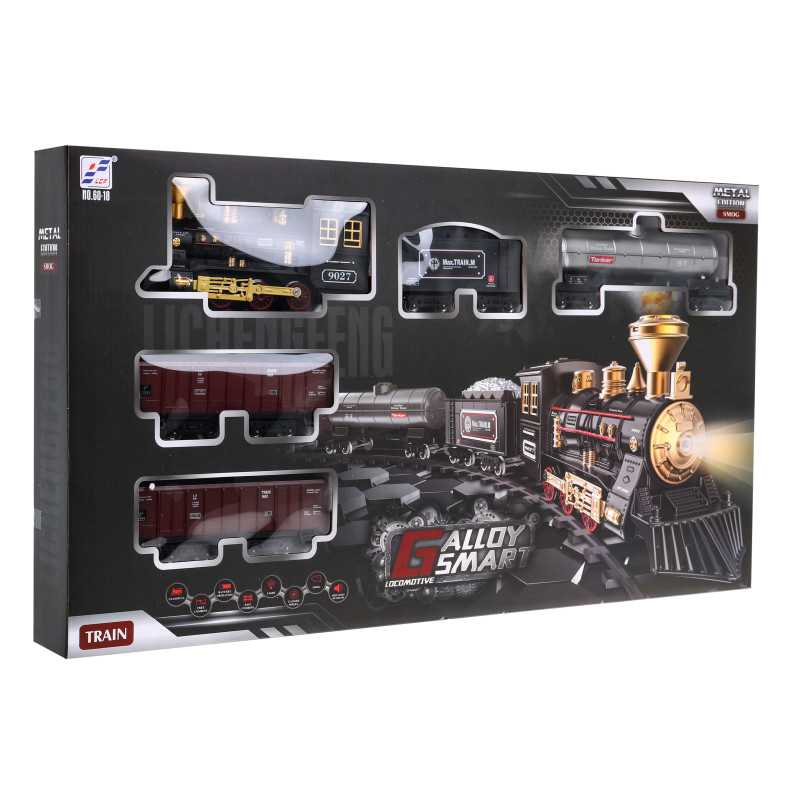 | Nuostabus traukinys su dūmų funkcija ir važiavimo garsais yra tinkamas vaikams nuo 5 metų. Žaislas maitinamas 4 x AA 1, 5 V baterijomis, kurios į komplektą neįeina. Baterijas montuojame į lokomotyvą. Traukinuko maršrutas yra elipsės formos, jo matmenys maždaug 143 cm x 106 cm. Važiuojant lokomotyvas iš kamino (pripildžius jį vandeniu - į rinkinį įtraukta vandens pypkė) leidžia dūmus, be to, užsidega priekinėje dalyje sumontuota lemputė. Bėgiai turi lengvą sujungimo būdą, dėl to juos saugu ir patogu naudoti. | |