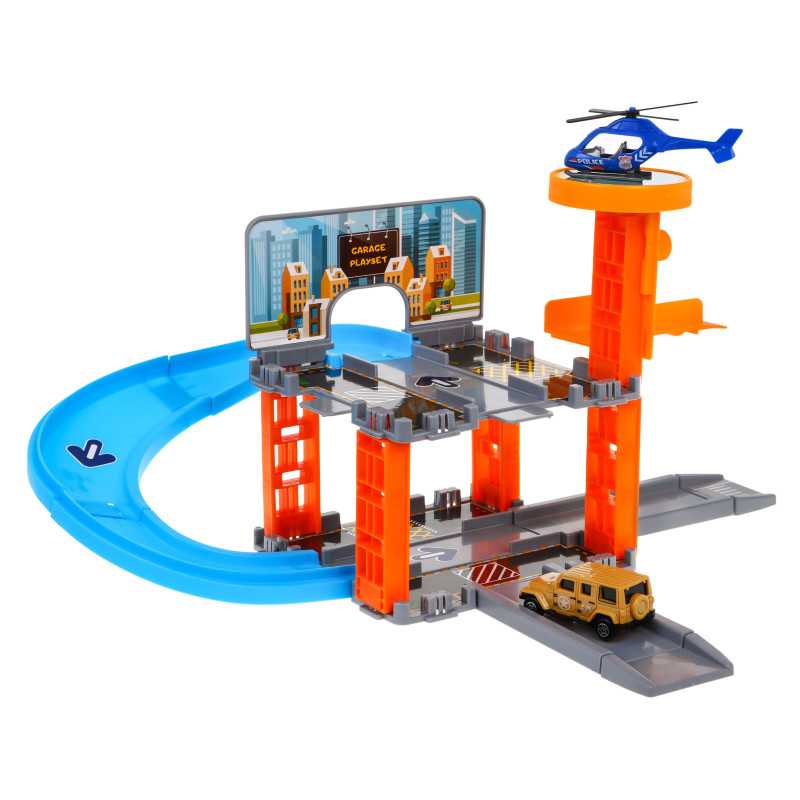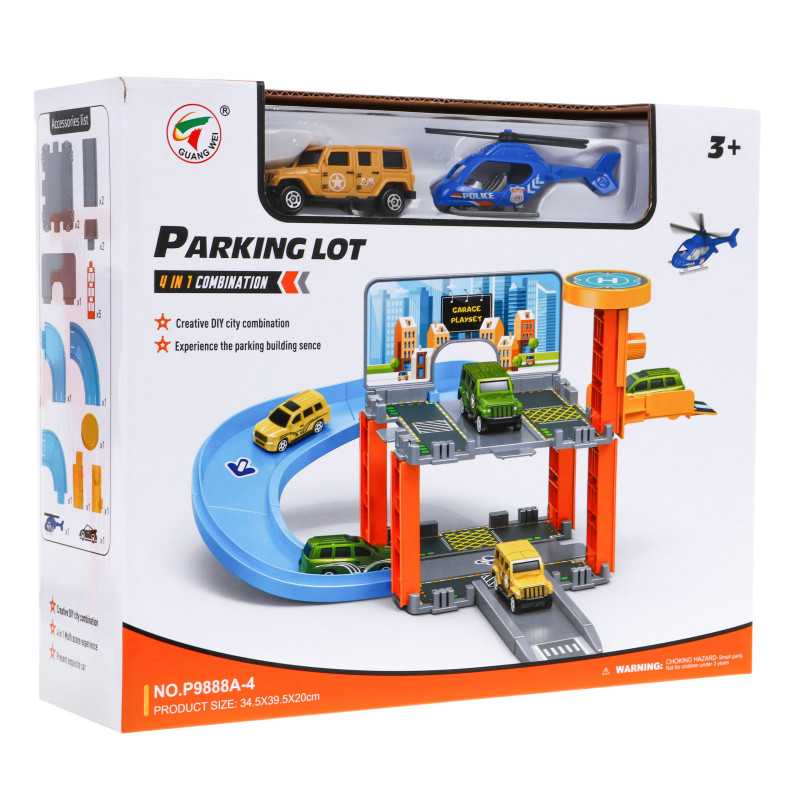 Trijų lygių automobilių stovėjimo aikštelė su automobiliu ir sraigtasparniu vaikams nuo 3 metų. Žaislas iš serijos "Miestas", jį galima sujungti su kitais šios serijos rinkiniais ir sukurti miestą, kurį sudaro automobilių stovėjimo aikštelė, policijos nuovada, gaisrinė ir statybvietė.